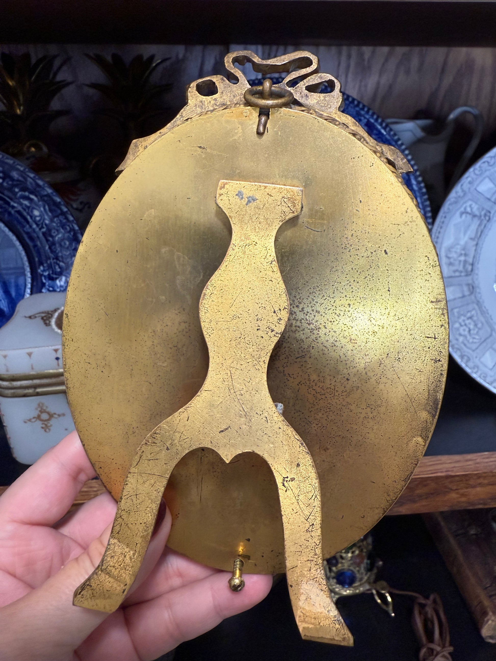 This 19th century French hand painted porcelain portrait is truly a stunning piece. The intricate bow hand painted details are accentuated by the gold gilded bronze frame, adding a touch of elegance to any home decor. A perfect addition to any art collection or a statement piece in any room. 7” tall by 5” wide . Comes with attached easel for easy displaying. Could be hung.